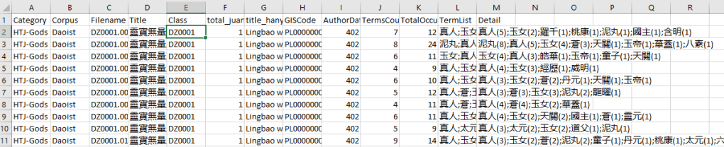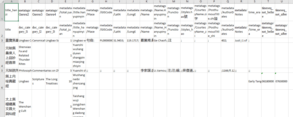 The CSV, when opened in Excel, turns up like this. We will be attaching the Daoist Canon’s metadata so it can be employed in analysis. You can also click on “Open Palladio” on the Tagstats page which will bring you to Palladio’s data upload page.