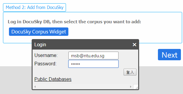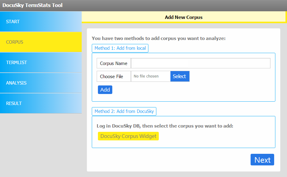 Click on “CORPUS”, and then on “DocuSky Corpus Widget” under “Method 2: Add from DocuSky”