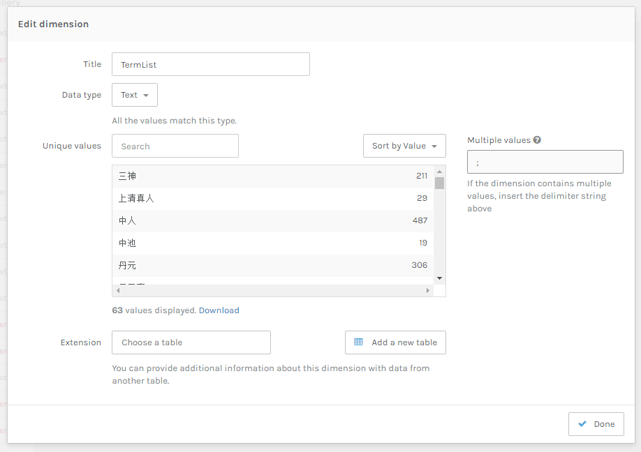 Enter a semicolon in the box below “Multiple values”. This indicates that there are multiple values in one record, and they are separated by a semicolon. Entering this will cause Palladio to split the terms following each semicolon. Click “Done”.