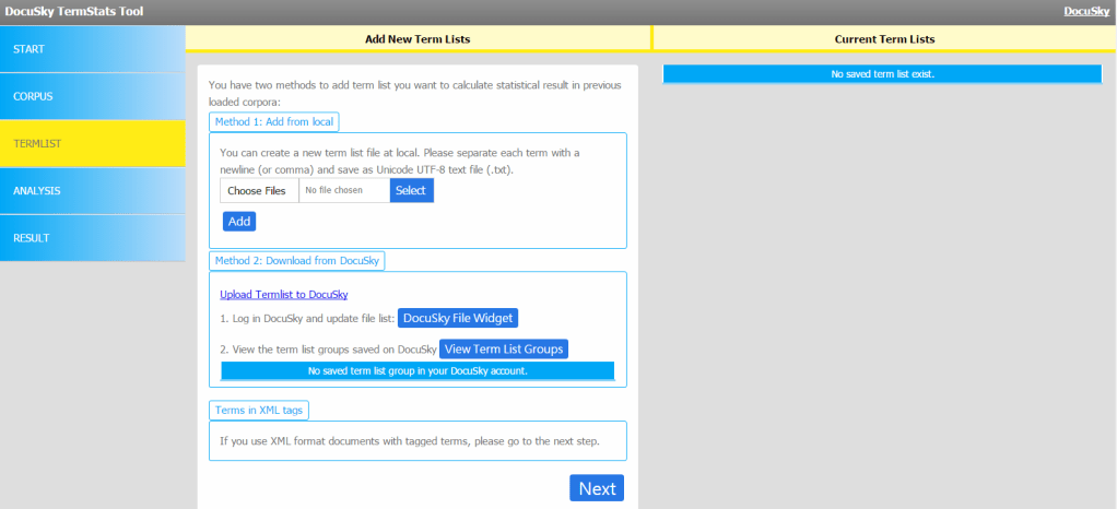 While you are waiting for the corpus to load, you can upload your vocabulary list. This could be critical vocabulary related to any particular genre that interests you. If you click on “TERMLIST” it will bring you here. Click on “Select” next to “Choose Files” under “Method 1: Add from local”.