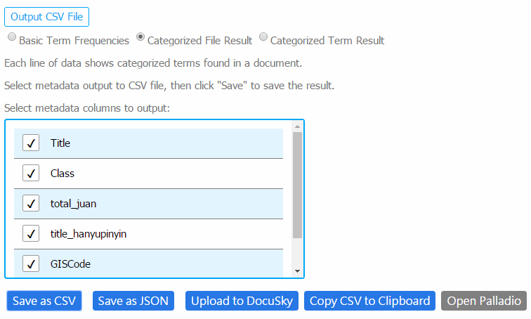 In our case, select “Categorized File Result”, choose all the metadata columns to output, and click “Save as CSV” to download it.