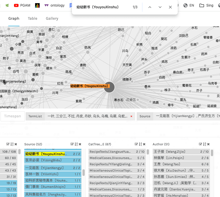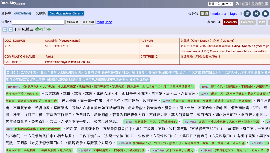 This application of the Polyglot data and DocuSky tools is the product of multiple contributors. Tracking a specific recipe to show its historical variations, demonstrates a method presented by Joachim Prackwieser in ICHSTEAM Frankfurt, 2023. See Prackwieser, forthcoming in East Asian Science Technology and Medicine. Technical demonstration presented by Stanley-Baker and Prackwieser in DADH Tainan 2023. 桂枝湯 data-subset and user-experience development by 洪一梅 and 黃嘉宏 within the DocuSky team. Termlist of Chinese drug terms produced from back-end data from the Polyglot Medicine: Knowledge Graph.
